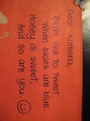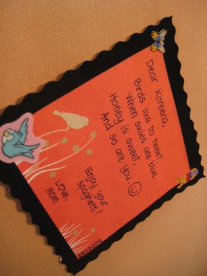Well, as you can see… I went through quite a bit of a thought-process for such a simple note for Kitreena. And oh yes, she is on the second rerun of her spaghetti boxed lunch from home. I made Spaghetti Carbonara but with some fresh chopped tomatoes and pickled artichokes the other day. Mama mia! Tanto gusto. Tutto belissimo. Abiss ito. Massu tido. Mmmuuuaaahhh! Buona notte, mia colibri!