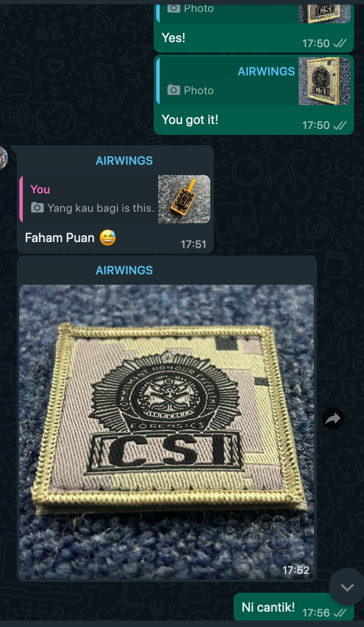 Untuk items yang flat like patches, the first picture has to be eye level. Maka sebaiknya lekat saja di dinding so people will see them as if they were shopping at our gallery. Our walls are all covered with blue felt/carpet, and the blue carpet is covered with our patches. And as for the 3D items like coins, caps, pins, metal badges, etc. gambarnya mestilah diambil dari pelbagai arah.