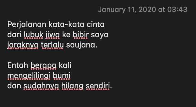 This is the draft of a poem I was trying to write over 4 years ago. It remains a draft even though I reminded myself to finish it a few days before January 11th this year. I diligently keyed it in to my iCalendar, kunun-kunun mesti habiskan dan muatnaikkan pada 11 January tahun ini, kebetulan saya baru terjumpa tersorok di Notes.