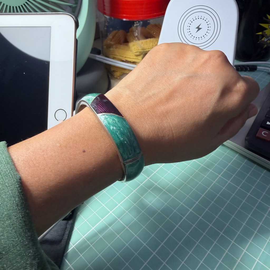 The bangle was not in a box when I got it. It was not wrapped, nor was it in a pouch or anything. Simon handed it to me bugil-bugil just like that. Yes, just like that. At first I thought, hmmm… green wasn’t really my color. Or even if it was, it wasn’t this green. Of all the 50 shades of green, this shade of green wasn’t really my shade of green. But I took it anyway, thanked Simon and kept it with my white bangle, my silver bangle and another green bangle that is in the shade-of-green-that-I-like bangle.
