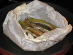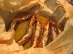 So yesterday, out of desperation to guttle my newly bought salted dried old fish, I came up with this idea: instead of pan-frying or deep-frying the stinky-o-smelly fishies, I oven-broiled them! To avoid from having to scrape the baking pan in case the fish would stick to it, I shaped a piece of baking paper into a ‘bowl’, poured half the amount of oil I usually use into the baking-paper bowl and voila! Into the oil the fishies swam and into the oven they broiled for about 25 minutes at 200°C. No stirring, flipping, flapping, spattering, splattering, and spatula-ing involved the whole 25 minutes.